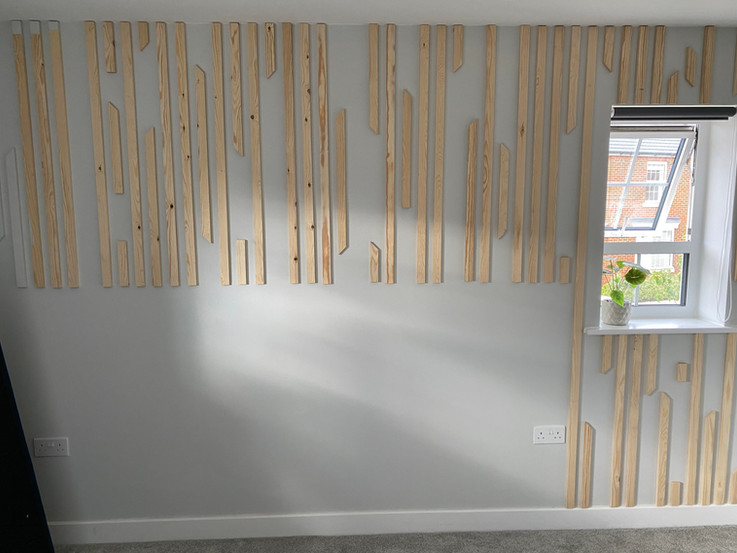 When planning this makeover, I was torn between replacing the wallpaper with another patterned paper, or just removing it entirely and painting all the walls the same colour. However, while working in the lounge on our Home Cinema panelling, I had an idea for a similar vertical panelled wall, but one that would incorporate a geometric design with angled cuts and different heights of strip wood coming from above and below. This would go around the headboard, framing the bed. This idea was in my head for a while, and I just couldn’t properly visualise what it would look like - or articulate it to my husband, who was incredibly worried that I had finally gone bonkers in my love of unique panelling! I sat down to roughly sketch out the idea with measurements, and instantly knew it would work!